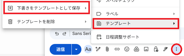 - 右下の「︙(メニュー)」をクリック → 「テンプレート」 → 「下書きをテンプレートとして保存」 → 「新しいテンプレートとして保存」を選びます。