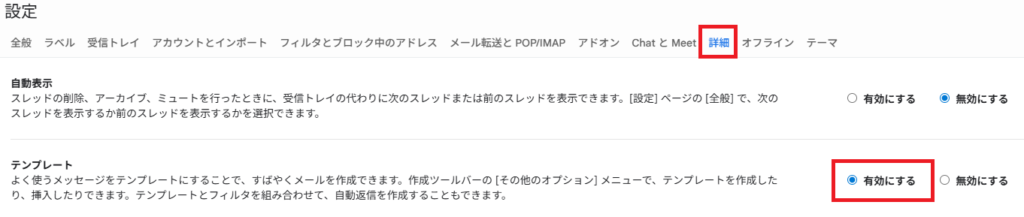 3.「テンプレート」という項目の「有効にする」にチェックを入れます。